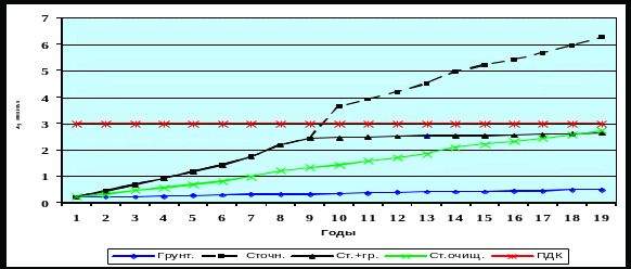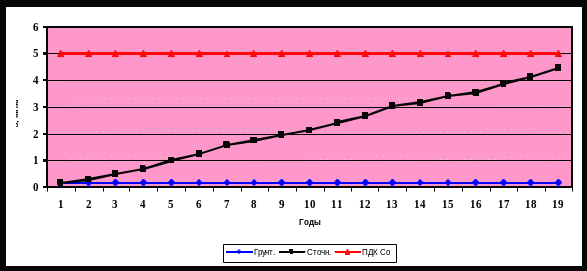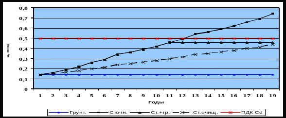 Прогноз по кадмию (рис. 5.) показал, что этот элемент накапливается в почве сравнительно быстро и к 12-му году достигает ПДК. Графики иллюстрируют варианты поливов грунтовой водой с 11-го года и дополнительной очистки воды от кадмия на очистных сооружениях, что позволит увеличить продолжительность безопасного орошения сточными водами.