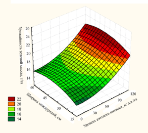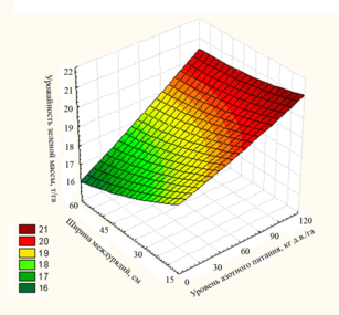 Методами множественного регрессионного анализа с помощью программного комплекса STATISTICA 6.0 была получена модель нелинейной зависимости урожайности зеленой массы сортов ярового рапса от уровня азотного питания и ширины междурядий (рис. 1).