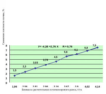 Установлена линейная регрессионная зависимость снижения плотности пахотного слоя почвы от запахиваемой массы растительных остатков ярового рапса. Математический анализ зависимости показывает, что дополнительное поступление растительных остатков в количестве 1,96…4,14 т/га снижает плотность почвы на 1,5…7,5% (рис. 5). Наибольшее их количество отмечается на варианте с дозой внесения азотных удобрений N120 кг/га д.в. 3,67…4,14 т/га, что на 32…43% выше по сравнению с контрольным вариантом.