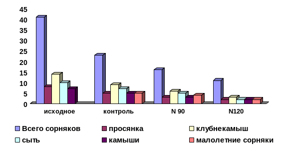 Рис. 6. Засоренность посевов ярового рапса сорной растительностью