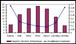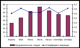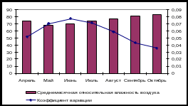 Статистическая обработка метеорологических данных позволила установить, что коэффициенты вариации среднегодовых значений температуры, осадков и относительной влажности воздуха колеблются в пределах от 0,2 до 0,03. Полученные величины характеризуеют незначительное отклонение метеопараметров от среднемноголетних значений и возможность долгосрочного прогнозирования гидрометеорологических факторов.