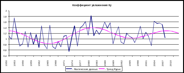 Для повышения точности прогнозных расчетов метеорологических параметров автором разработана эмпирическая модель прогнозирования гидрометеорологических факторов с использованием уравнения Фурье, которая учитывает цикличность изменения метеорологических параметров. Результат расчета по модели реализован в виде графика (рисунок 3), позволяющего проследить общую тенденцию изменения коэффициента природного увлажнения в течении длительного ряда метеонаблюдений.
