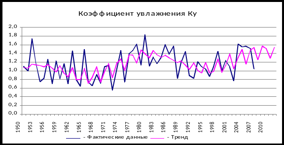 В качестве интегрального показателя изменчивости климата был выбран коэффициент природного увлажнения Ку, который наиболее объективно характеризует тепло-влагообеспеченность периодов в различные годы.