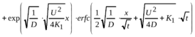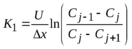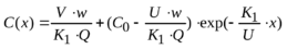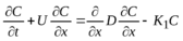 где С – концентрация загрязняющего вещества, мг/л; U – скорость потока воды, м/с; t – время, с; D – коэффициент продольной диффузии, м2/с; К1 – коэффициент скорости распада загрязняющего вещества в воде в результате химической реакции первой степени, с-1; при этом K1>0.