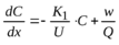 В случае, когда створ находится на достаточном (для перемешивания ЗВ) расстоянии от точечного источника, можно ограничиться одним измерением. Разделив левые и правые части уравнений (4) на скорость течения воды U (м/с) и расход воды Q (м3/с), получим уравнение изменения концентрации ЗВ по длине русла: