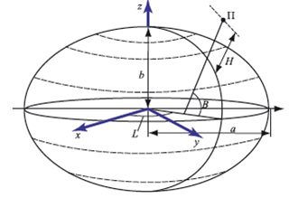 В рамках этой модели геодезическая широта точки П – величина угла В между нормалью к поверхности эллипсоида и плоскостью экватора. Геодезическая долгота точки П – величина угла L между плоскостью нулевого меридиана и плоскостью меридиана, проходящего через точку П. Положительное направление отсчета долгот – от нулевого меридиана к востоку. Геодезическая высота Н – расстояние по нормали от точки П до поверхности эллипсоида.