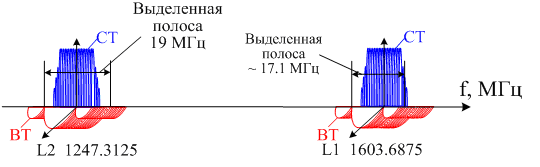 На рис. 4.13 схематично изображены спектры квадратур сигналов НКА Глонасс-М, использующих частотное разделение.