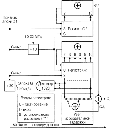 При этом реинициализация (сброс в начальное состояние) регистра Х1(А) производится после выдачи 4092 бит, т. е. последние три бита полной (4095-битной) последовательности отбрасываются. Аналогично, реинициализация регистра Х1(В) производится после выдачи 4093 бит, т. е. с отбрасыванием двух последних бит. В результате для каждого укороченного таким образом кадра ПСП Х1 фаза последовательности Х1(В) сдвигается на один бит относительно последовательности Х1(А). Этот процесс продолжается до тех пор, пока число укороченных кадров не достигнет 3750, после чего генерируется признак конца «эпохи» Х1, равной 1,5 с, и происходит реинициализация регистров Х1(А) и Х1(В). За одну эпоху генерируется 15 345 000 разрядов ПСП Х1. Термин «эпоха» здесь используется в смысле «период».