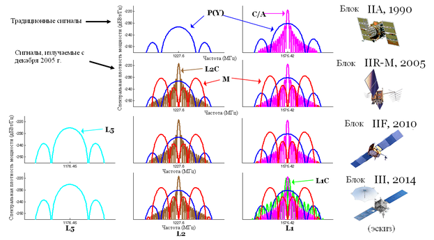 Рис. 4.18 Спектры сигналов НКА GPS различных поколений