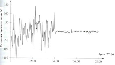 Согласно директиве Президента США режим S/A был выключен в начале мая 2000 г, однако МО США сохраняет за собой право по собственному усмотрению вновь вводить его, чтобы исключить использование коммерческой АП для высокоточных навигационных определений в военных целях. На рисунке 4.17 приведен график изменения погрешности навигационных определений по высоте в момент выключения режима селективного доступа 2 мая 2001г.