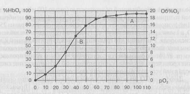 в крови соответствует определенное процентное насыщение гемоглобина кислородом. Кривую зависимости процентного насыщения гемоглобина кислородом от величины парциального напряжения называют кривой диссоциации оксигемоглобина (рис. 21). Анализ хода этой кривой сверху вниз показывает, что с уменьшением рО