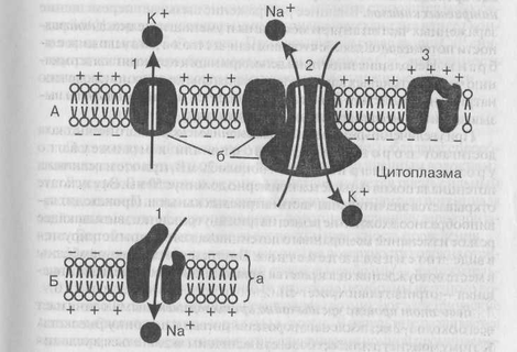 На А: каналы «утечки калия» (1), «натрий-калиевый насос» (2)