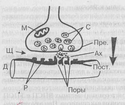 3)постсинаптическую мембрану — утолщение прилегающей поверхности следующего нейрона.