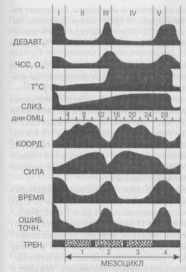 Рис. 37. Изменения различных показателей работоспособности женского организма в разные фазы овариально-менструального цикла и тренировочные циклы