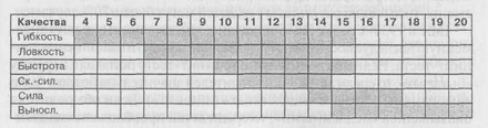 Хотя имеются индивидуальные варианты сроков их наступления, все же можно, в среднем, выделить общие закономерности. Так, сенситивный период проявления различных показателей качества быстроты приходится на возраст 11-14лет и к 15-летнему возрасту достигается его максимальный уровень. Близкая к этому картина наблюдается в онтогенезе и для проявления качеств ловкости и гибкости.