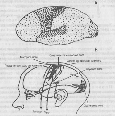 На Б: первичные (проекционные) поля коры больших полушарий