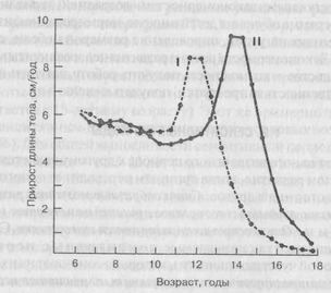 Особо отмечают период полового созревания (так назы ваем ы й переходный или пубертатный период (греч.: пубертис — оперение), выделяя препубертатный период (11-13 лет), 1 фазу пубертата — мальчики 13-15 лет и девочки 11-13 лет, 2 фазу пубертата— мальчики 15-17 лет и девочки 13-15 лет. В этот период происходит существенная гормональная перестройка в организме, развитие вторичных половых признаков, заметное ухудшение условно-рефлекторной деятельности, двигательных навыков, увеличиваются вегетативные изменения при нагрузках, возрастаетутомление, затрудняется речь, отмечается неуравновешенностьэмоциональныхреакций и поведения. Заметным является пубертатный скачок роста — значительный годовой прирост длины тела — удевочекоколо 1 Злет, у мальчиков — около 14 лет (рис. 44).