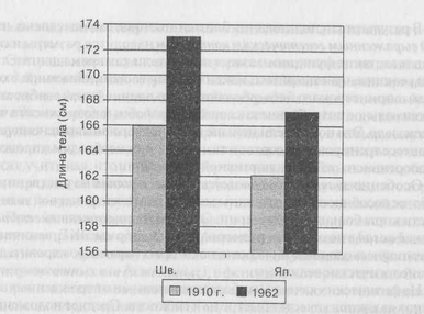 Подростки и юноши 14-17 лет Москвы, Ленинграда и Киева в 60-70-х г.г. по сравнению с 1923-1925 г.г. оказались выше на 10-13 см, тяжелее на 9-11 кг, окружность их груди — больше на 4.7 см.