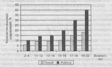 Малый двигательный опыт, слабое отражение в сознании функциональных изменений в организме при физических нагрузках обусловливают недостаточное развитие субъективных ощущений усталости. К тому же дети не умеют в нужной мере отражать изменения своего внутреннего состояния в речевых отчетах. Даже в возрасте 8-9летв41 % случаевуних вообще отсутствуетощущение усталости, а при его наличии в 77% случаев дети сообщают о наступлении усталости лишь после окончания работы. Это требует особого внимания к тщательной дозировке мышечных нагрузок, особенно при работе с дошкольниками.