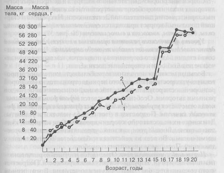 Массателадо 14 лет изменяется медленно. С 14-15 лет начинает­ся ее бурное увеличение, которое сопровождается быстрым прирос­том массы сердца (рис. 51). Вес мышечной массы достигает к 15 годам 32% массы тела, а к 17-18 годам — взрослого уровня (44%).