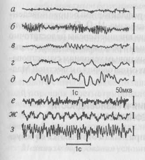некоторых эмоциональных состояниях —тета-ритм (4-7 колебаний в 1 с); при глубоком сне, потере сознания, наркозе — дельта-ритм (1 -3 колебания в 1 с).