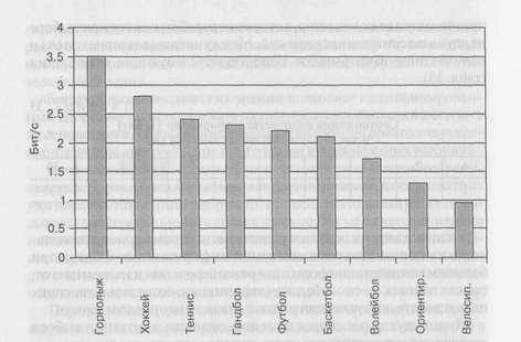 4-6 бит./с (например, у футболистов 3.44 бит./с и выше, у фехтовальщиков 5.26-6.32 бит./с).