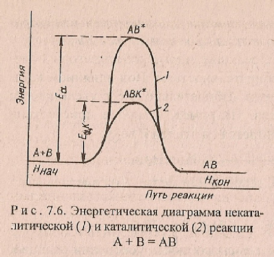 Энергетическая диаграмма некаталитической (1) и каталитической (2) реакции