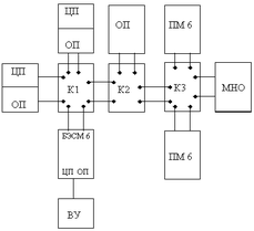 Пример 2. Три ЭВМ объединены в комплекс для распределения заданий, поступающих на обработку. Одна из них выполняет диспетчерскую функцию и распределяет задания в зависимости от занятости одной из двух других обрабатывающих ЭВМ. Это локальный многомашинный комплекс.