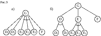 Для изображения процесса редукции задач и получающихся при этом альтернативных множеств подзадач используются обычно графоподобные структуры, вершины которых представляют описания задач/подзадач, а дуги связывают любую пару вершин, соответствующих редуцируемой задаче и одной из результирующих подзадач, причем стрелки на дугах указывают направление редукции. Пример такой структуры приведен на рис. 10 (а): задача G может быть решена путем решения либо задач D1 и D2, либо E1, E2 и E3 либо задачи F. При этом ребра, относящиеся к одному и тому же множеству подзадач, связываются специальной дугой. Чтобы сделать такую структуру более наглядной, вводятся дополнительные промежуточные вершины, и каждое множество результирующих задач группируется под своей родительской вершиной. При этом структура на рис.10(а) преобразуется в структуру, изображенную на рис.10(б): для двух из трех альтернативных множеств подзадач добавлены соответственно вершины D и E.