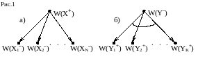 Если в некоторой конфигурации X+ очередной ход делает игрок ПЛЮС, и имеется N допустимых ходов, приводящих соответственно к конфигурациям X1, X2, . . . XN , то для решения задачи W(X+) необходимо решить по крайней мере одну из подзадач W(Xi). Действительно, так как ход выбирает игрок ПЛЮС, то он выиграет игру, если хотя бы один из ходов ведет к выигрышу см. рис. 1(а).
