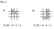 Рассмотрим, к примеру, игру «крестики-нолики» на квадрате 33. Игрок ПЛЮС ходит первым и ставит крестики, а МИНУС нолики. Игра заканчивается, когда составлена либо строка, либо столбец, либо диагональ из крестиков (в этом случае выигрывает ПЛЮС) или ноликов (выигрывает МИНУС). Оценим размер полного дерева игры: начальная вершина имеет 9 дочерних вершин, каждая из которых в свою очередь 8 дочерних; каждая вершина глубины 2 имеет 7 дочерних и т.д. Таким образом, число концевых вершин в дереве игры равно 9!=362880, но многие пути в этом дереве обрываются раньше на заключительных вершинах. Значит, в этой игре возможен полный просмотр дерева и нахождение выигрышной стратегии. Однако ситуация изменится при существенном увеличении размеров квадрата или же в случае неограниченного поля игры.