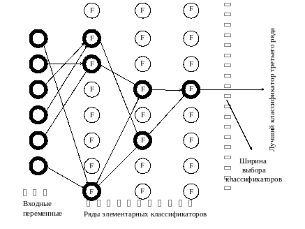Входные аргументы и промежуточные переменные сопрягаются попарно, и сложность комбинаций на каждом ряду обработки информации возрастает (как при массовой селекции), пока не будет получена единственная модель оптимальной сложности.