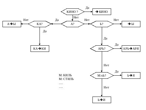 С точки зрения программирования на алгоритмических языках достоинства подобного представления очевидны — эта блок-схема без затруднений переводится в текст программы, например, на языке Ассемблера или С++. Однако само составление подобной блок-схемы при появлении существительных новых типов становится, очевидно, все более и более утомительным занятием. Для иллюстрации этого предположим, что дана