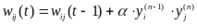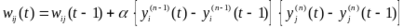 где yi(n-1) – выходное значение нейрона i слоя (n-1), yj(n) – выходное значение нейрона j слоя n; wij(t) и wij(t-1) – весовой коэффициент синапса, соединяющего эти нейроны, на итерациях t и t‑1 соответственно; – коэффициент скорости обучения. Здесь и далее, для общности, под n подразумевается произвольный слой сети. При обучении по данному методу усиливаются связи между возбужденными нейронами.