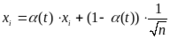 где xi – i-ая компонента входного образа, n – общее число его компонент, (t) – коэффициент, изменяющийся в процессе обучения от нуля до единицы, в результате чего вначале на входы сети подаются практически одинаковые образы, а с течением времени они все больше сходятся к исходным. Весовые коэффициенты устанавливаются на шаге инициализации равными величине