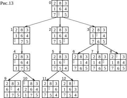 На рис.13 приведено дерево, полученное в результате применения алгоритма поиска вширь к некоторой начальной конфигурации игры в восемь, причем алгоритм работал только до глубины 4. В вершинах дерева помещены соответствующие описания состояний. Эти вершины занумерованы в том порядке, в котором они были раскрыты.