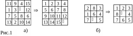 Типичным представителем класса задач, для которых подходит представление (формализация) в пространстве состояний, является головоломка, известная как игра в пятнадцать. В ней используется пятнадцать пронумерованных (начиная с 1) подвижных фишек, расположенных в клетках квадрата 4x4. Одна клетка этого квадрата остается всегда пустой, так что одну из соседних с ней фишек можно передвинуть на место этой пустой клетки (изменив, тем самым, местоположение пустой клетки). На рис.1а изображены две конфигурации фишек. Рассмотрим задачу перевода начальной (первой) конфигурации в целевую (вторую) конфигурацию. Решением этой задачи будет подходящая последовательность сдвигов фишек, например: «передвинуть фишку 8 вверх, фишку 6 влево и т.д.». Более простым вариантом этой головоломки является квадрат 3x3 и восемь фишек на нем – пример соответствующей задачи показан на рис.1б.
