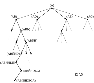 Шаг 5. Проверить , нет ли среди дочерних вершин целевых. Если есть хотя бы одна целевая вершина, то окончание алгоритма и выдача решения задачи, получающегося просмотром указателей от найденной целевой вершины к начальной. В противном случае перейти к шагу 2.