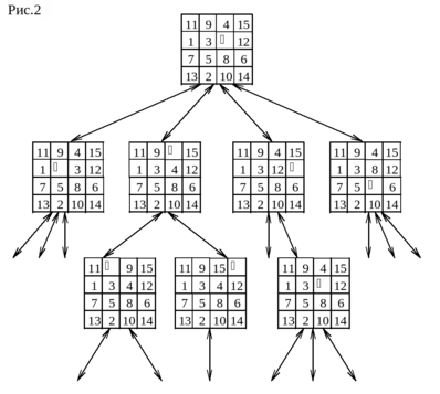Пространство состояний можно представить в виде графа, вершины которого соответствуют состояниям, а дуги – применяемым операторам. Тогда решение задачи – это путь, ведущий от начального состояния к целевому. На рис.2 показана часть пространства состояний для игры в пятнадцать, в каждой вершине помещена та конфигурация фишек, которую она представляет. Пространства состояний могут быть большими и даже бесконечными, но в любом случае предполагается конечность множества допустимых операторов и счетность множества возможных состояний.
