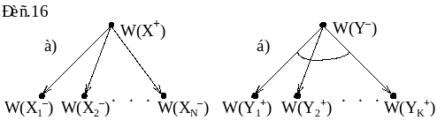 Если в некоторой конфигурации X+ очередь делать ход за игроком ПЛЮС, и имеется N допустимых ходов, приводящих соответственно к конфигурациям X1, X2, . . . XN , то для решения задачи W(X+) необходимо решить по крайней мере одну из подзадач W(Xi) (так как ход выбирает ПЛЮС, то он выиграет игру, если хотя бы один из ходов ведет к выигрышу) см. рис. 16(а).