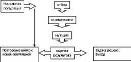 Работа ГА представляет собой итерационный процесс, который продолжается до тех пор, пока не выполнятся заданное число поколений или какой-либо иной критерий останова. На каждом поколении ГА реализуется отбор пропорционально приспособленности, кроссовер и мутация.