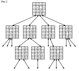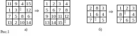 Типичным представителем класса задач, для которых подходит представление в пространстве состояний, является головоломка, известная как игра в пятнадцать – см. рис. 1(а). В ней используется пятнадцать пронумерованных (от 1 до 15) подвижных фишек, расположенных в клетках квадрата 44. Одна клетка этого квадрата остается всегда пустой, так что одну из соседних с ней фишек можно передвинуть на место этой пустой клетки, изменив тем самым местоположение пустой клетки. Заметим, что более простым вариантом этой головоломки является квадрат 33 и восемь фишек на нем – пример соответствующей задачи показан на рис.1(б).
