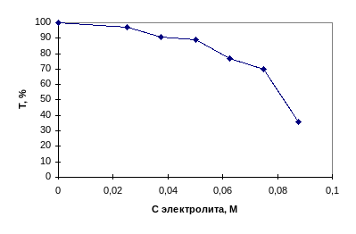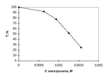 Рис 2. Зависимость пропускания золя Fe(OH)3 от концентрации электролита (K2SO4) по прошествии 20 мин.