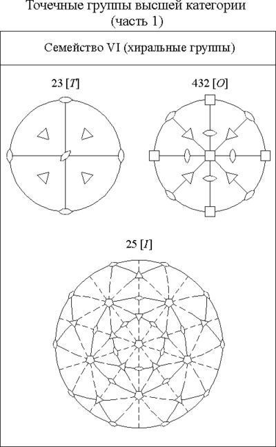Примечание. В семействах I – V некоторые группы, стоящие в началах рядов, повторяются (в виде разных проекций). Не употребляемые варианты обозначений групп заключены в круглые скобки. Вместо символа