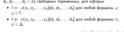 Семантическая таблица 〈Γ, ∆〉 называется выполнимой, если существует такая I и d1...dn принадлежащие DI ,что для любой фи из Г выполняется, что I |= фи(x1,...,xn)[d1...dn] и для любой пси из ∆ выполняется что I |=/=пси(x1,..,xn)[d1..dn].