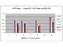 При использовании подхода OpenMP+MPI в MPI-программу для отдельного узла вставлялись директивы OpenMP. Отсюда довольно неожиданный вывод – даже на мультипроцессоре с 4 процессорами на общей памяти, используемом в качестве узла IBM SP, OpenMP проигрывает на регулярных программах MPI-подходу. Это объясняется лучшей локализацией доступа к данным в MPI-программе, что приводит к более эффективному использованию кэш-памяти.