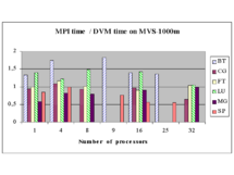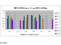 Эффективность DVM-программ гораздо выше, чем эффективность HPF, и вполне сравнима с эффективностью MPI. Для оценки масштабируемости DVM-программ приведены данные о соотношении времен выполнения MPI-версий и DVM‑версий на ЭВМ МВС-1000м [25] для всех восьми тестов класса С (тесты этого класса ориентированы на высокопроизводительные параллельные системы, требуют много памяти и поэтому не могут выполняться на малом числе процессоров).