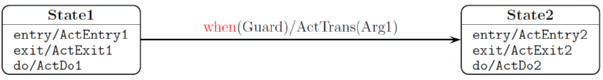 Когда объект находится в состоянии State1, и завершается выполнение деятельности ActDo1, диаграмма предписывает сделать следующее: