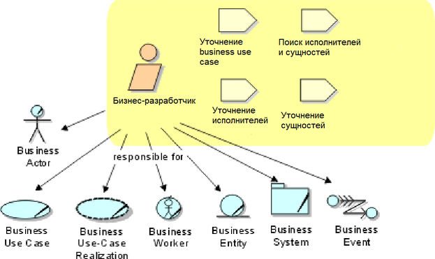 Модель бизнес-анализа (модель бизнес-объектов) создается другим исполнителем в рамках RUP – бизнес-разработчиком, но руководит ее созданием бизнес-аналитик.