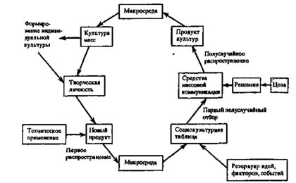 по которой можно определить различные этапы распространения культурных образцов и барьеры, возникающие на пути этого процесса. Модель (см. рис. 3) представляет собой замкнутый цикл, который начинается с индивидуального творчества и заканчивается слиянием созданного культурного образца с массовой культурой общества (68, с. 94).
